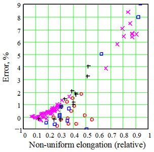 where Dm - is coefficient calculated by the measured stray field parameters determined by the set of local strains in the area of the occurred macrocrack, the equivalent of which, as can now be understood from the results obtained above, is the average relative longitudinal strain (εnon-uni) in the area of non-uniform strain (in the "neck" area) i.e. Dm = εnon-uni. This coefficient is called the "limiting stress concentration factor".